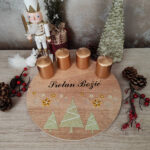 Bring warmth and uniqueness to your home this Advent season with this elegant Advent wreath. This modern and sophisticated decor consists of a background with the motif of Christmas decorations with gold tones, made of quality wood material, on which are displayed balls, stars, snowflakes and pine trees, creating a Christmas atmosphere full of symbolism.