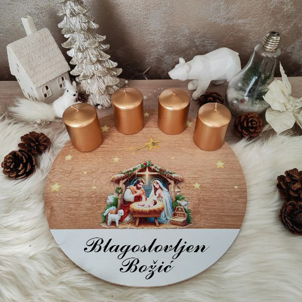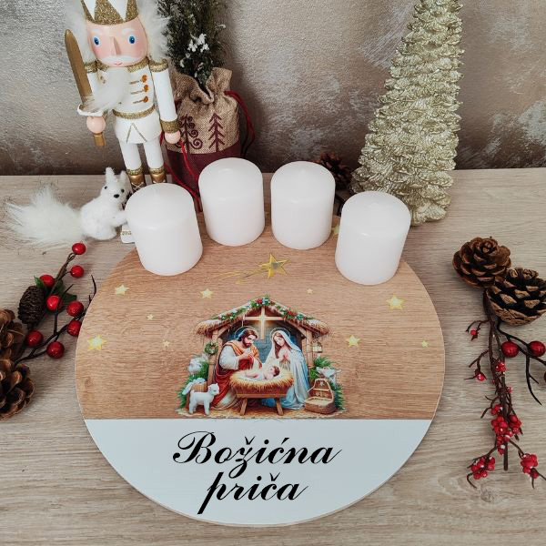 Bring warmth and uniqueness to your home this Advent season with this elegant Advent wreath. This modern and sophisticated decor consists of a base with a Christmas crib motif, made of quality wood material, on which the Holy Family is depicted, creating a Christmas atmosphere full of symbolism.
